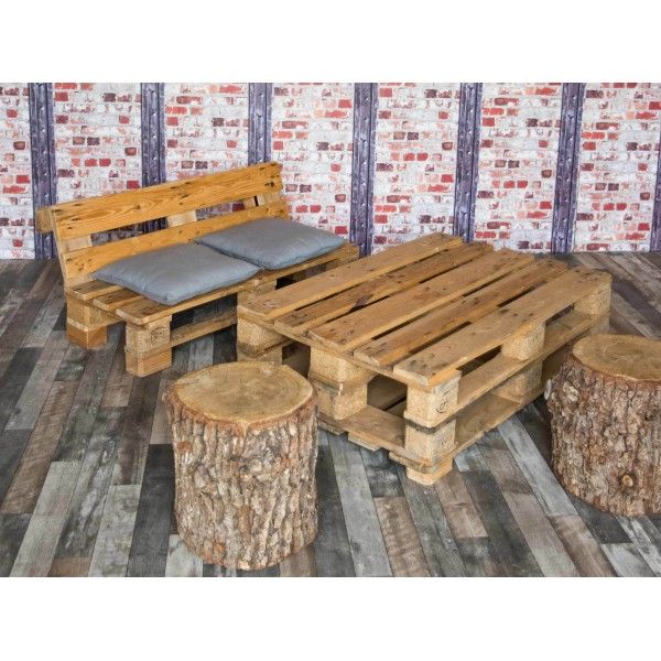 Notre salon de jardin est composé de 1 canapé avec coussin + 2 rondins + 1 table basse